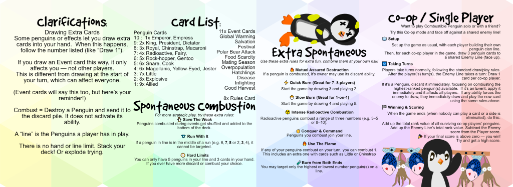 The Spontaniously Combustible Penguin was an odd comedy “zine” I made in elementary school, where I would write silly jokes and songs on a piece of notebook paper and pass it to kids in class. In college, my kickball team was also named Spontaniously Combustible Penguins. Over time, I had an idea for a card game that mixed one of my favorite games, Love Letter, with a game played with my family growing up: skit-skat (or 31 as I’ve learned it is also called.) I’m not sure if that is exactly what I’ve created, but I’m pretty fond of the little penguins!