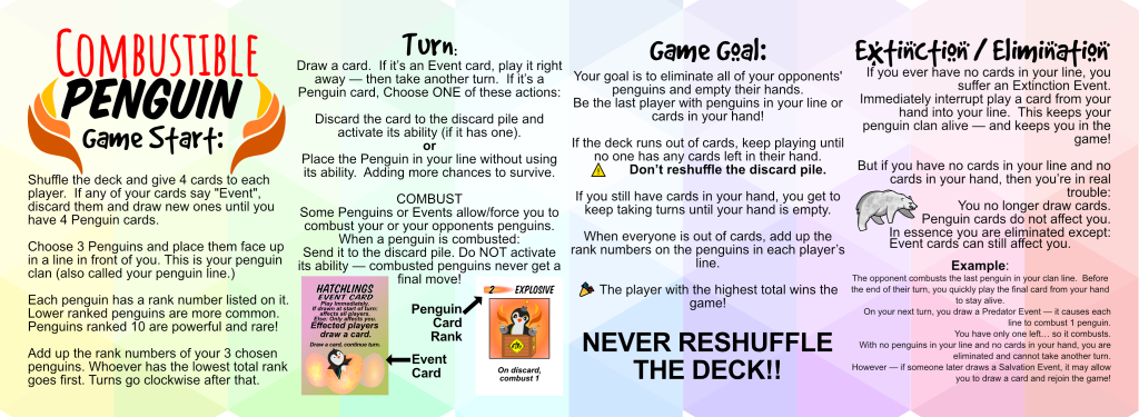 Turn: Draw a card. Play events immediately, then continue the turn. Draw until you get a penguin. Then choose: discarding a card and activating an ability, OR placing a card on the line, forbearing ability.  COMBUST can target opponents’ penguins. Place them onto the discard pile, but DO NOT activate any abilities.